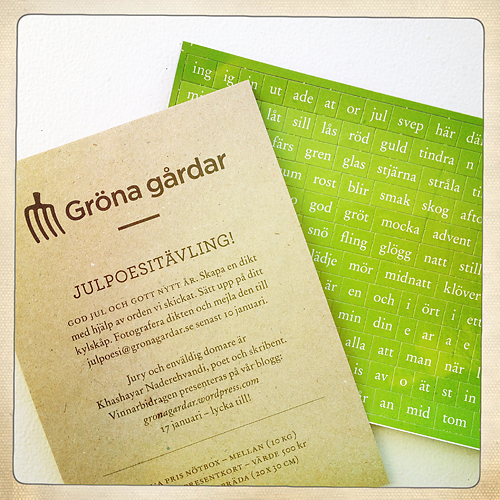 Tack alla som skickade in bidrag till julpoesitävlingen. Jag sitter i detta nu och går igenom dem, läser och njuter. Man blir förvånad över den stora variationen av dikter som går att skapa med exakt samma ord.